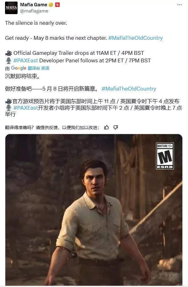 目前官方尚未发布太多宣传物料,但下个月我们将迎来玩法预告片。开发商通过《四海兄弟》游戏官方X账号确认,新预告片将于2025年5月8日(美国东部时间上午11点)在PAX East展会期间公开。届时预告片或将展示游戏场景、战斗玩法,甚至可能透露更多剧情设定。