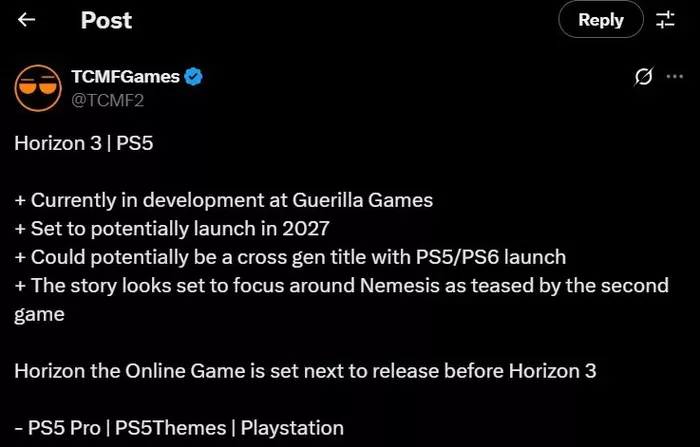 近日知名爆料人TCMFGames透露,Guerrilla Games计划在2027年发布《地平线3》,该作有望成为PS6首发大作。而《地平线》多人游戏将在《地平线3》之前推出。