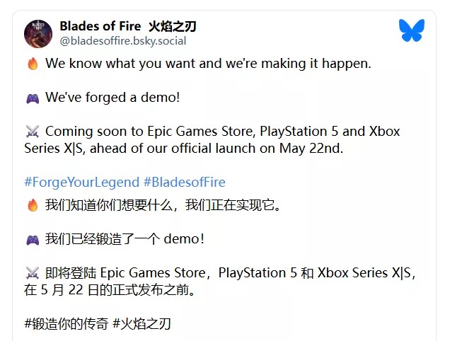 此前,《恶魔城:暗影之王》系列、《银河战士:萨姆斯归来》《银河战士:生存恐惧》背后的西班牙开发商MercurySteam与发行商505 Games正式公布了第三人称动作RPG新作《烈焰之刃》,现在开发商在BlueSky平台透露,本作将于近期发布免费试玩版本,为持观望态度的玩家提供尝鲜机会。